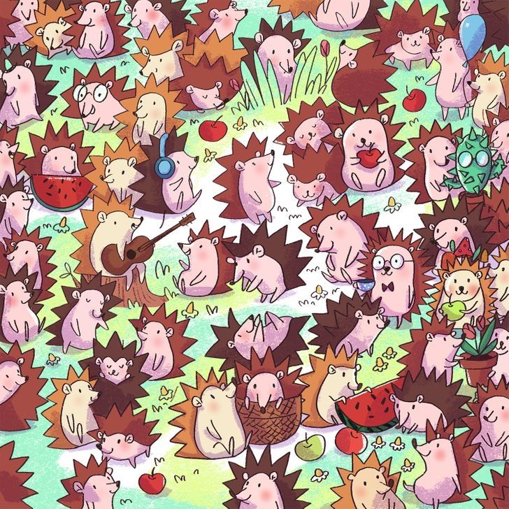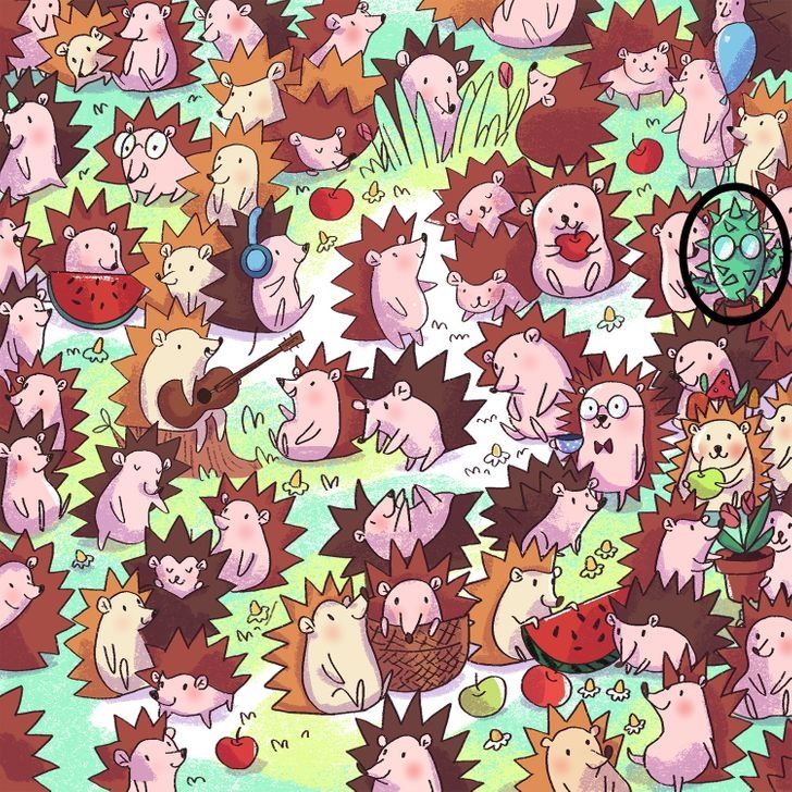 En este simple y colorido dibujo, se puede observar decenas de distintos erizos. En este nuevo reto visual se encuentra una planta infiltrada, la cual es difícil de encontrar en una primera instancia.
