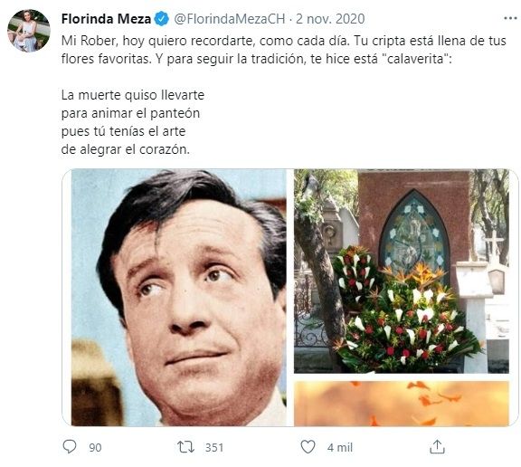 "Mi Rober, hoy quiero recordarte, como cada día. Tu cripta está llena de tus flores favoritas. Y para seguir la tradición, te hice está 'calaverita': La muerte quiso llevarte para animar el panteón pues tú tenías el arte de alegrar el corazón", redactó en Twitter junto a una fotografía de Chespirito, otra de un florero y una de la tumba del actor llena de flores rojas y blancas.