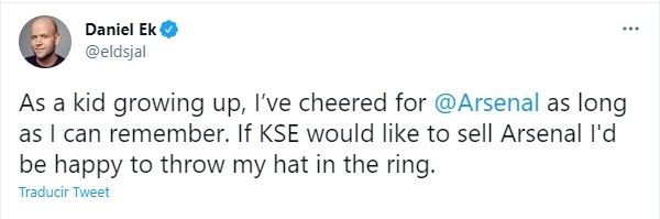 El fundador de Spotify, Daniel Ek, ha mostrado su interés en comprar el Arsenal si el propietario, Stan Kroenke, decide vender el club de la Premier League. El multimillonario de la industria de la música, reveló que es seguidor del Arsenal desde 1991. Lo eligió como su club inglés favorito porque su compañero sueco Anders Limpar jugó para los Gunners.