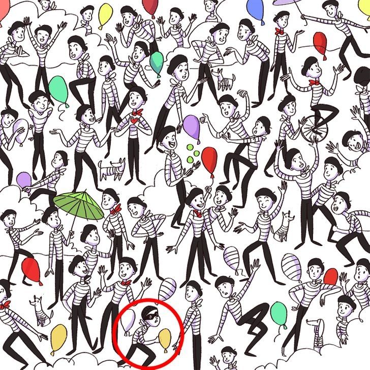 En este simple dibujo, se puede observar decenas de mimos y globos de colores sobre un fondo blanco. En este nuevo reto visual se encuentra un malviviente infiltrado, el cual es difícil de encontrar en una primera instancia.