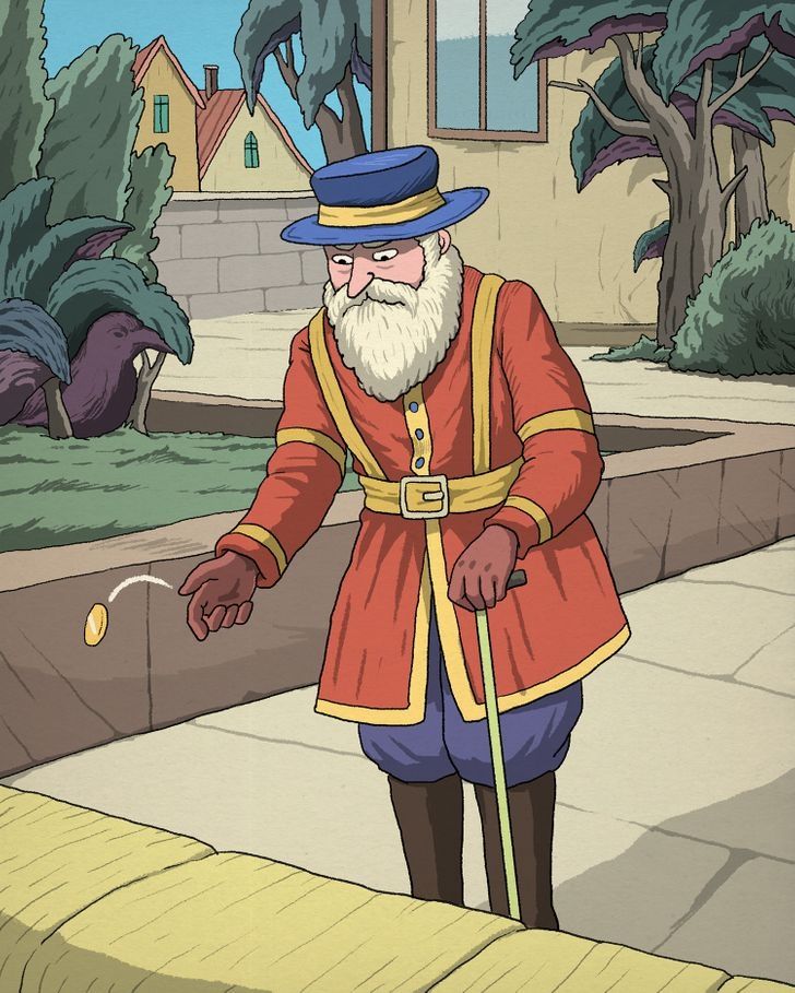 En esta lámina se puede ver a un anciano arrojando una moneda a un estanque, muy cerca de él se halla un ave observándolo. En este reto visual se encuentra camuflado un plomífero animal.