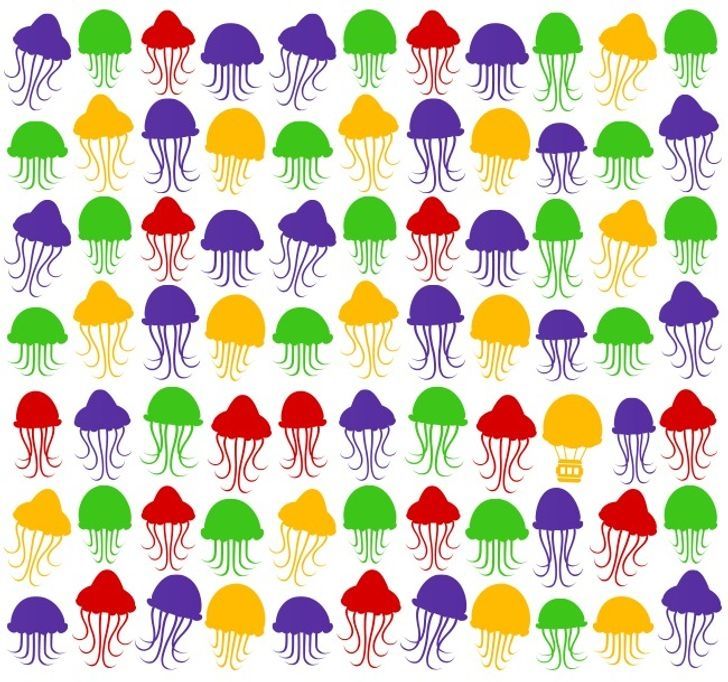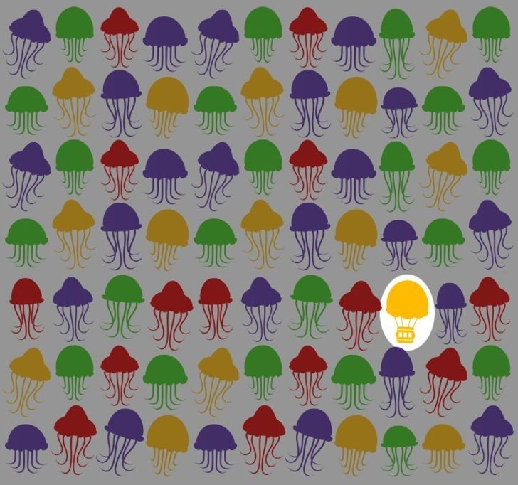 El acertijo presenta una imagen vibrante llena de medusas de diversos colores dispuestas sobre un fondo blanco. Entre estos elementos marinos, se ha camuflado un globo que los participantes deben encontrar. La tarea, aunque parece sencilla, requiere una observación detallada y una capacidad para distinguir pequeñas diferencias en un entorno visualmente complejo.