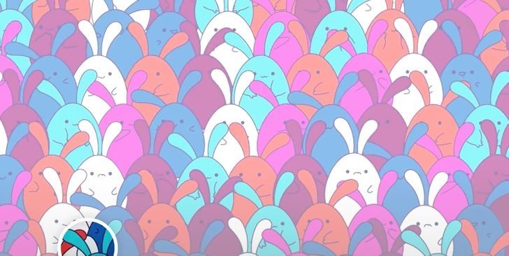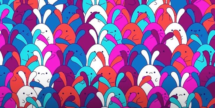 En esta lámina se puede observar una multitud de conejos con colores surrealista uno al lado del otro. En este reto visual se encuentra un alimento infiltrado.