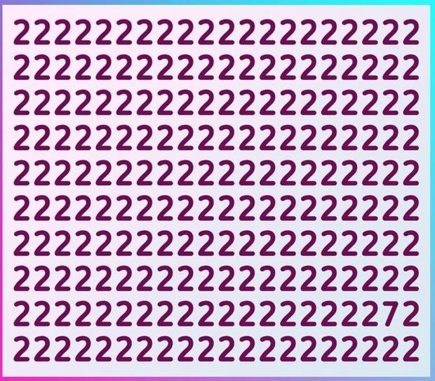 En esta colorida lámina, se puede observar una lámina repleta de números 2 de color púrpura oscuro sobre un fondo claro. En este nuevo reto visual se halla un número distinto camuflado que es difícil de encontrar en una primera instancia.