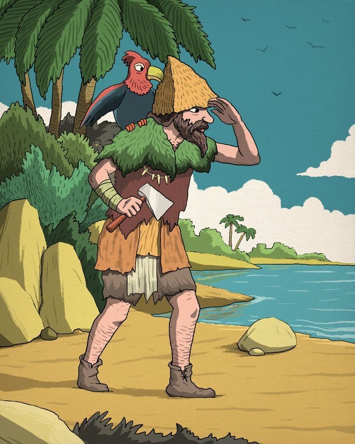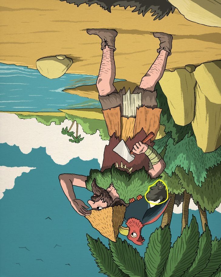 En esta lámina se puede ver a un náufrago con un pájaro en sus hombros observando el mar desde una inhóspita isla. En este reto visual se encuentra una cara camuflada en la imagen.