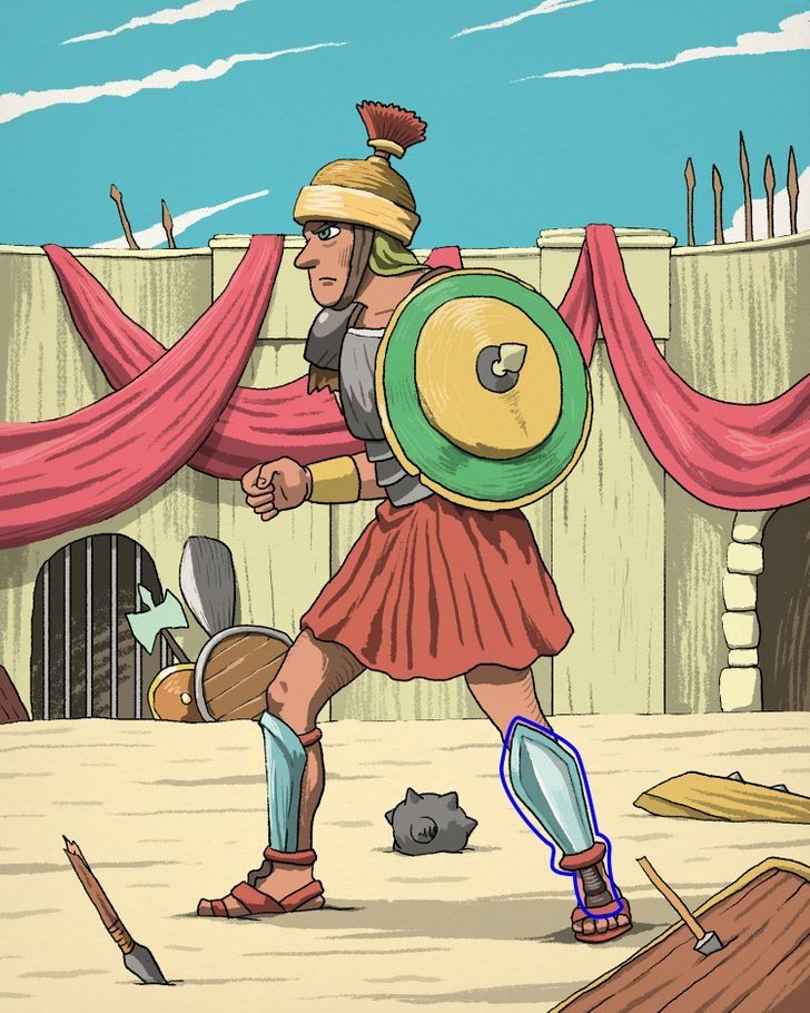 En esta lámina se puede ver a un gladiador en el campo de batalla sin una herramienta fundamental. En este reto visual se encuentra camuflado un objeto en la imagen.