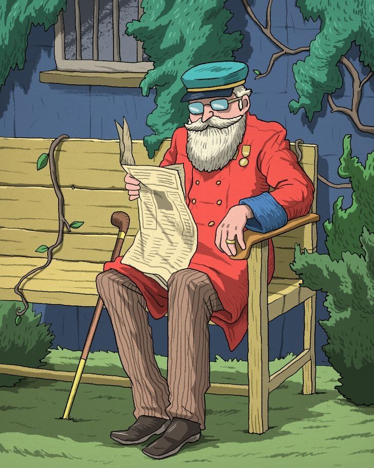 En esta lámina se puede ver a un longevo coronel leyendo un periódico sentado en una banca. En este reto visual se encuentra un objeto importante para él.