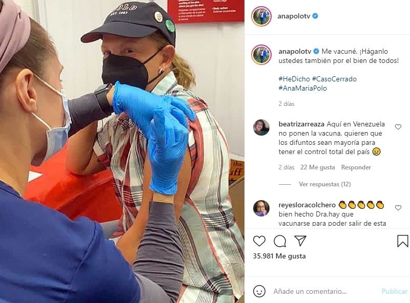 La mujer, de 61 años de edad, subió una instantánea de cuando estaba siendo inoculada contra el coronavirus y escribió: "Me vacuné. ¡Háganlo ustedes también por el bien de todos!". Muchos de sus seguidores aplaudieron su iniciativa. "Bien hecho Dra. Hay que vacunarse para poder salir de esta historia que ya pesa bastante. Gracias por animar a la vacunación, nuestros científicos han trabajado duro para que tengamos un poco de luz en esta oscuridad", escribió una internauta.