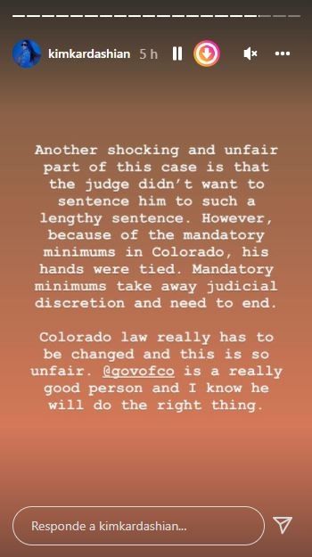 “Otra parte impactante e injusta de este caso es que el juez no quiso condenarlo a una sentencia tan larga. Sin embargo, debido a la obligatoriedad en Colorado, tenía las manos atadas. Los mínimos obligatorios le quitan la discreción a los mínimos judiciales y eso necesita acabar. La ley de Colorado realmente tiene que cambiarse y esto es muy injusto. El gobernador de Colorado es una muy buena persona y sé que hará lo correcto” continuó Kim Kardashian con su extenso mensaje.