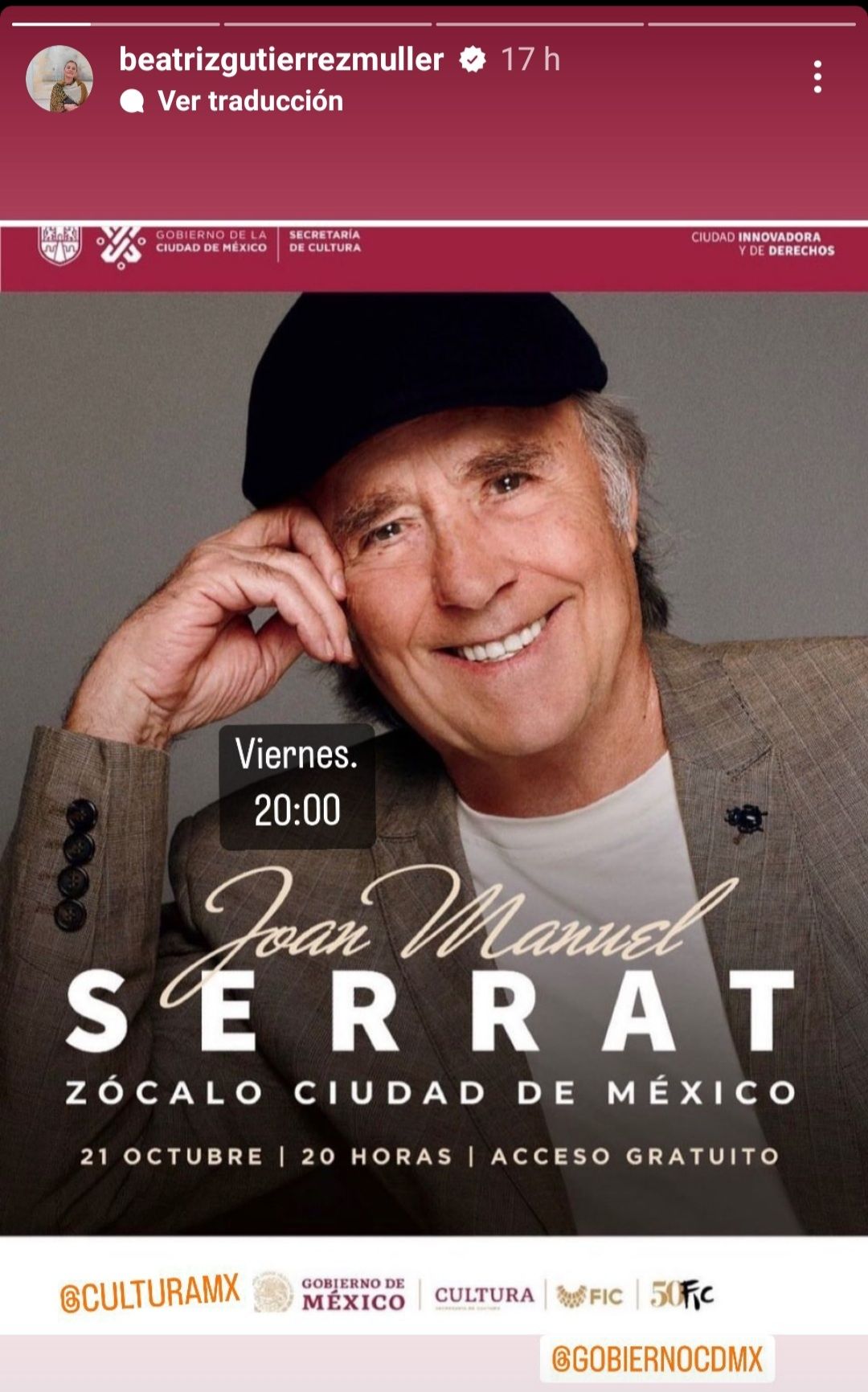La primera dama difundiendo el evento mexicano en el que aparece Joan Manuel Serrat
