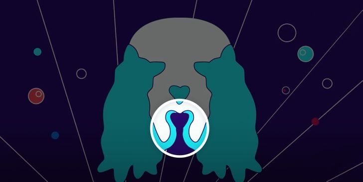 En esta lámina se puede observar una cabeza de perro y sus orejas parecen gatos sobre un fondo surrealista de color azul. En este reto visual se encuentra otro animal escondido en la imagen.