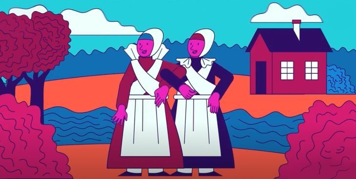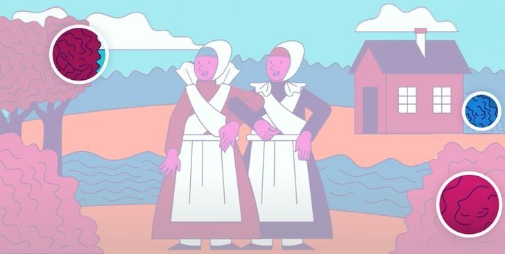 En esta colorida lámina se puede ver a dos mujeres de campo en el centro de la imagen. En este reto visual se encuentran camuflados algunas caras en la imagen.
