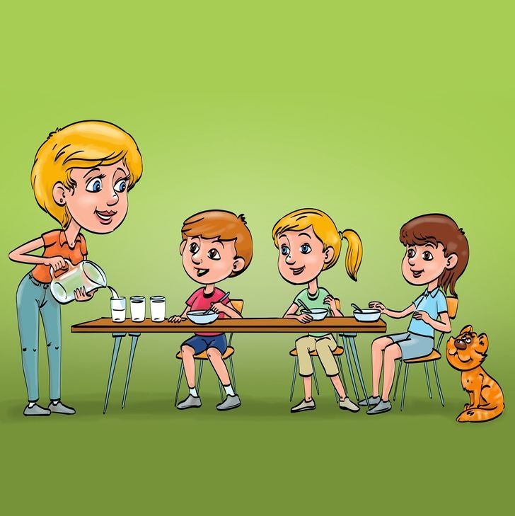 En esta mencionada lámina se puede observar una caricatura de una familia compuesta por una mamá y tres hijos sentados alrededor de una mesa, a punto de desayunar, con la mirada de su feliz mascota. En este nuevo reto visual posee una anomalía que es difícil de encontrar en una primera instancia.