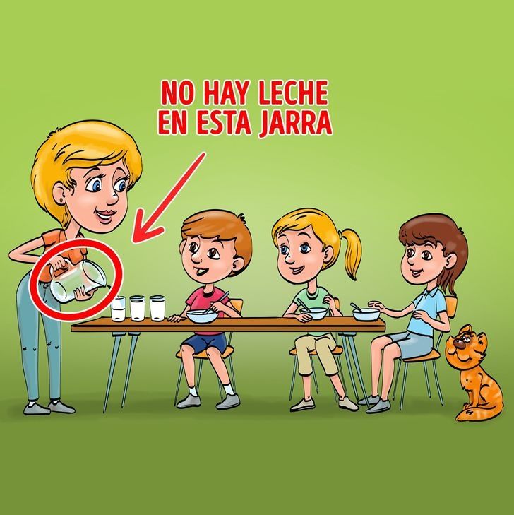 A continuación, les dejamos la solución de este reto visual que puso a varios jóvenes y adultos a trabajar el poder visual de sus ojos. El error se encuentra muy cerca del centro de la imagen. Así lo podemos observar en esta última imagen donde se señala con una flechas y círculo de color rojo y además se aclara que con letras “No hay leche en esta jarra”. Los esperamos a todos nuevamente a realizar la próxima aventura.