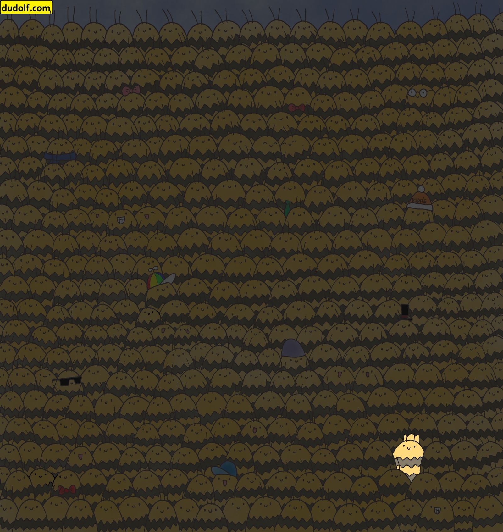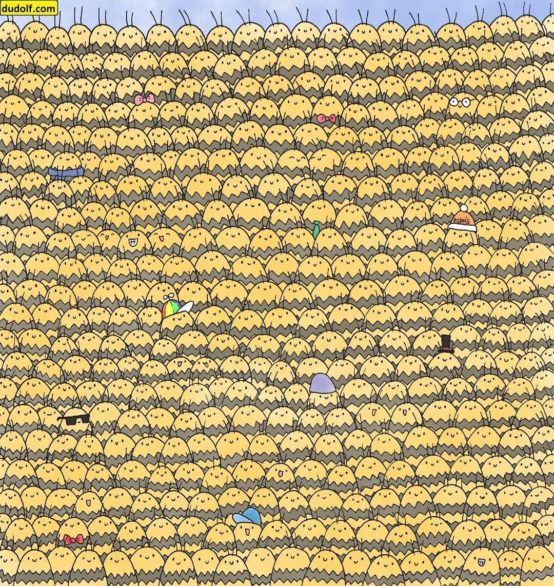 En este sencillo dibujo, del húngaro Gergely Dudás, conocido como Dudolf, se puede observar cientos de a abejas, una al lado de la otra en un fondo celeste. En este nuevo reto visual se encuentra la cabecilla de estos insectos que es difícil de encontrar en una primera instancia.