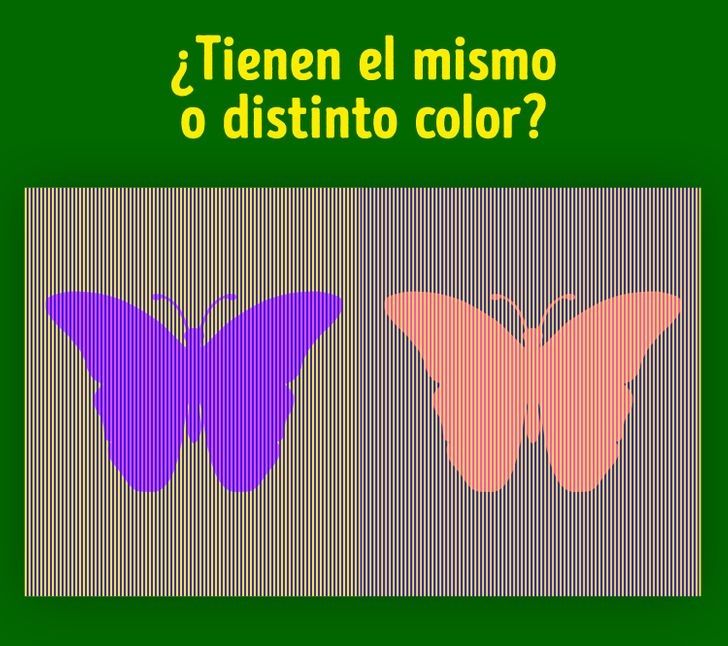 A continuación, está la solución de este reto visual que puso a varios jóvenes y adultos a trabajar la capacidad de sus ojos. Ambas mariposas tienen el mismo color. Las rayas verticales que tienen encima genera un efecto visual que hace que parezcan distintas, pero lo cierto es que las dos son de color violeta.
