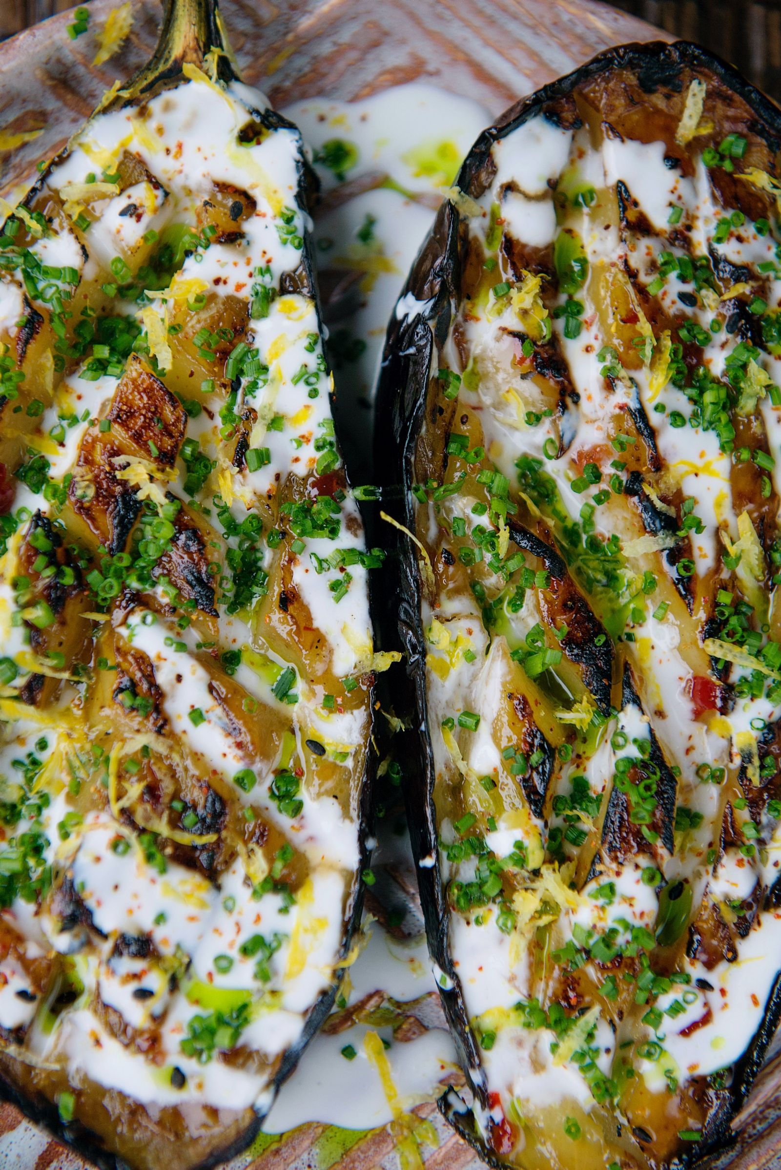 Lavamos las berenjenas, las cortamos en mitades y las hacemos sudar como te indicamos en la nota. Luego colocamos las mitades en una placa, con un poco de aceite, horneamos por 10 minutos para obtener parte de la pulpa. Reservamos.
