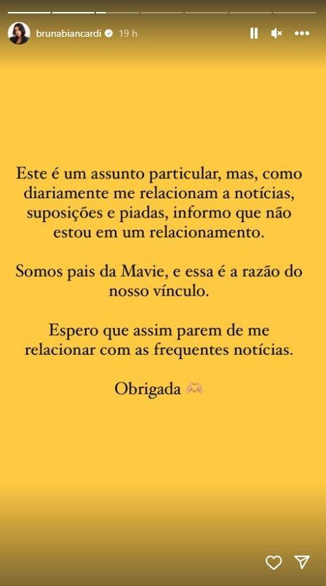 "Se trata de un asunto privado, pero como a diario estoy expuesta a noticias, suposiciones y bromas, les informo que no tengo pareja. Somos los padres de Mavie, y ésa es la razón de nuestro vínculo", expresó Biancardi en un texto que subió a sus Insta Stories. Luego finalizó el mensaje expresando: "Espero que así dejen de relacionarse con las frecuentes noticias. Gracias". Con este mensaje, dejó en claro que ya no quiere que la vinculen sentimentalmente con el jugador de fútbol.