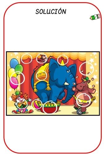 En esta colorida lámina podemos observar un show de circo, que incluye un elefante, un hipopótamo, un mono y un payaso que sostiene varios globos de colores. Debajo de la misma aparece otra imagen que a primera instancia parece igual, pero no es así.
