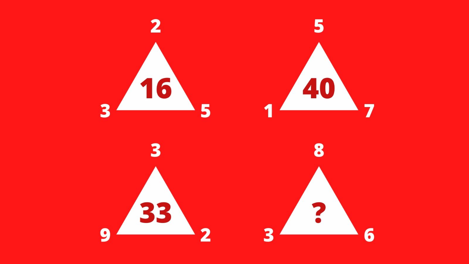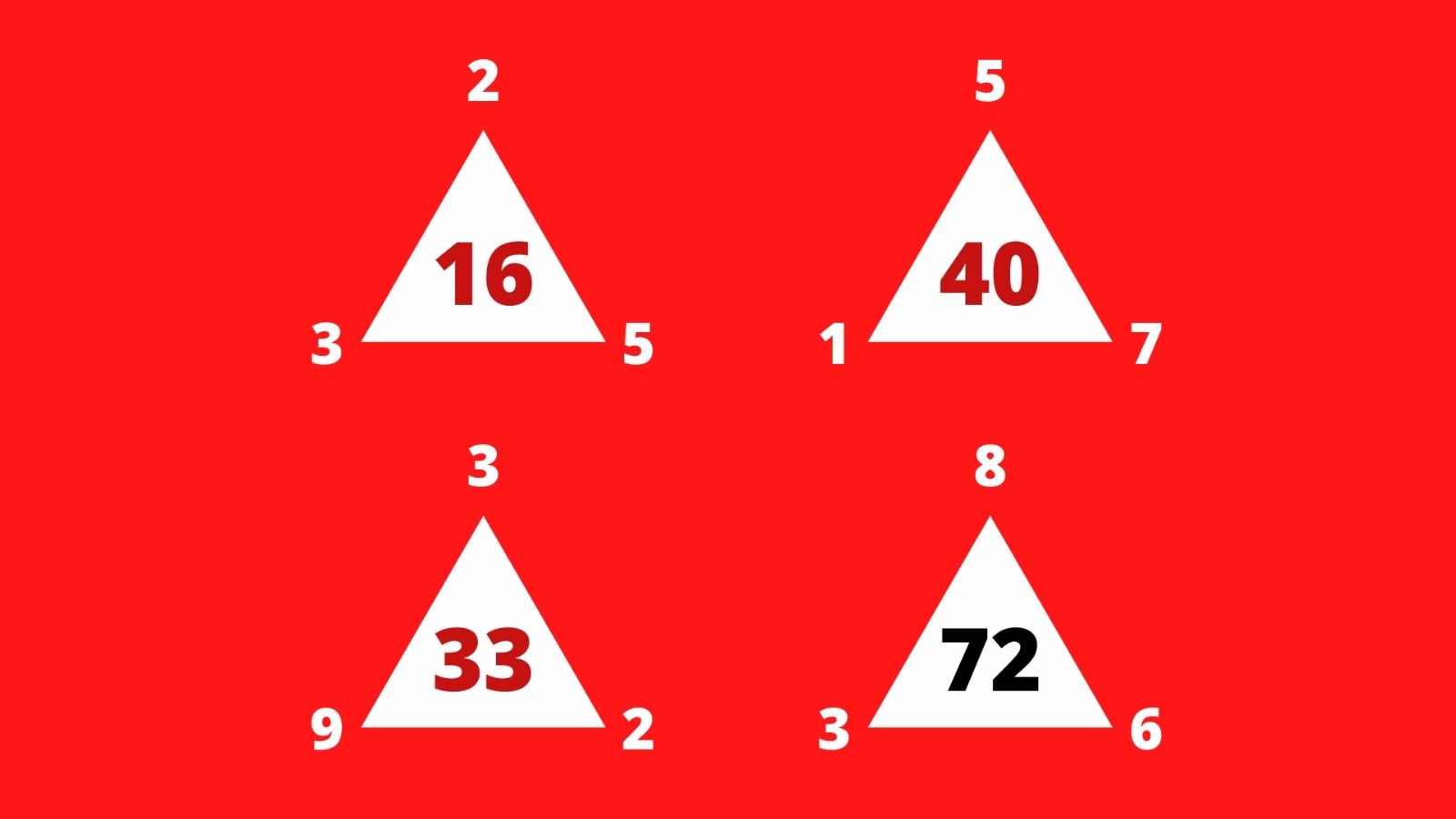 En la imagen se puede ver un grupo de cuatro triángulos sobre un fondo rojo. En los primeros tres casos, hay un número en cada uno de los vértices y otro en el centro de la figura. En el último, el valor central, que es el producto de una operación, ha sido reemplazado por un signo de interrogación.