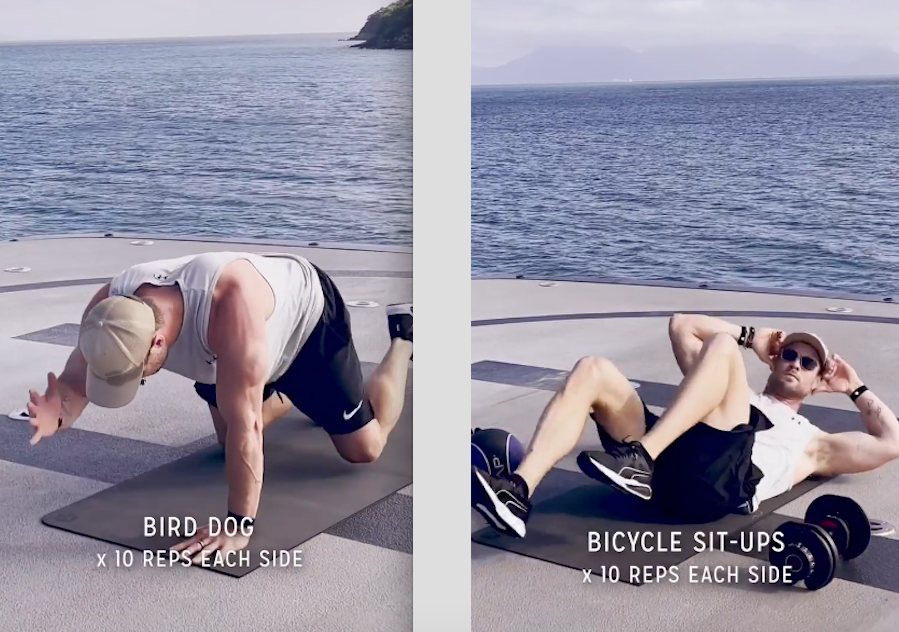 La rutina diaria del protagonista de “Thor: Amor y Trueno” incluye “Bird Dog”, para trabajar abdomen, lumbares, caderas y hasta hombros; “Bicycle Sit Ups” -abdominales de bicicleta-, el ejercicio llamado “Superman alternado” que se realiza levantando el brazo y la pierna contraria al mismo tiempo (10 de cada lado); “Tijeras verticales” -ideal para fortalecer abdomen y glúteos- y “Abdominales mariposa”.