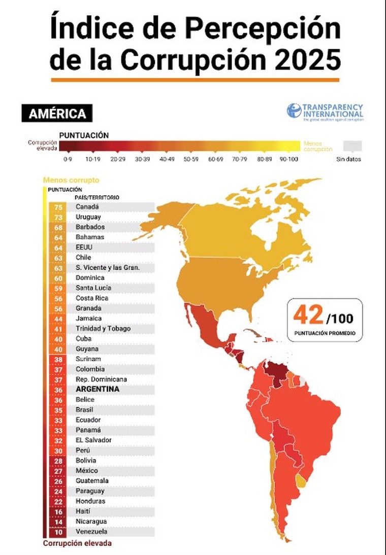 Argentina obtiene 36 puntos en el índice 2025. Se ubica por debajo del promedio del continente americano, que es de 42. Dentro de la región, queda en el puesto 15 de 33 países. El dato confirma un desempeño débil y una pérdida de terreno sostenida en los últimos años.