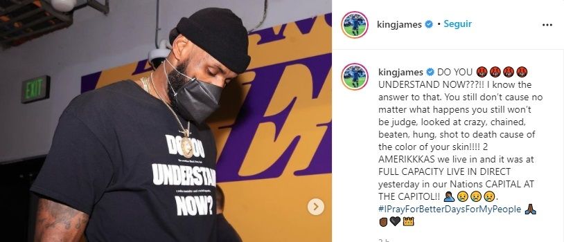 Era de esperarse, entonces que el jugador de Los Angeles Lakers se exprese respecto a lo sucedido en el Capitolio, algo que James entendió que debía hacerlo este jueves con un mensaje en el cual se lo pudo apreciar con las emociones desbordadas por lo sucedido y luciendo una remera con una frase: "Do you understand now?" (¡Entiendes ahora?)