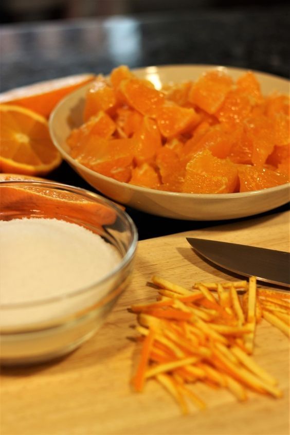 Colocamos los gajos de naranja en un recipiente, luego cortamos en juliana la cáscara de naranja. Incorporamos el azúcar y mezclamos. Cocinar a potencia máxima por 8 minutos, revolvemos nuevamente y le damos unos 5 minutos más.