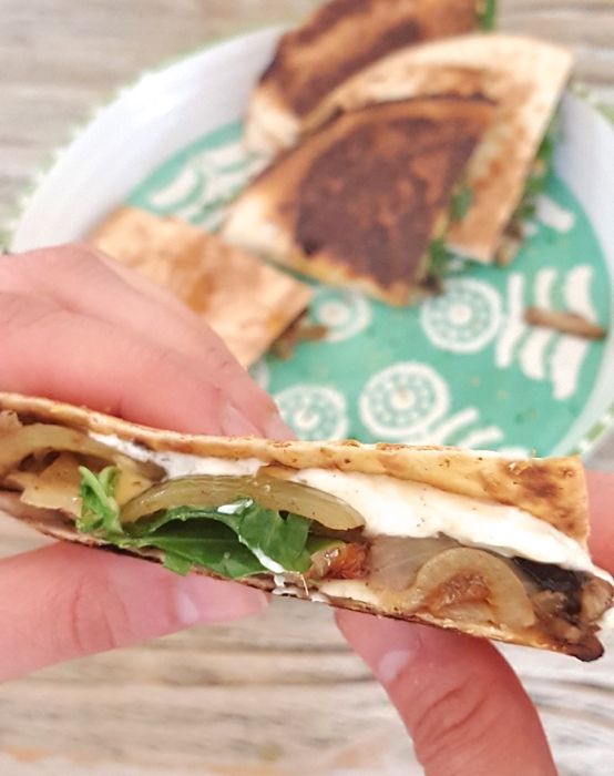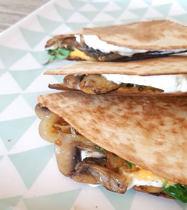Fácil y delicioso: quesadillas de cebollas caramelizada y hongos ¡en 5 minutos!
