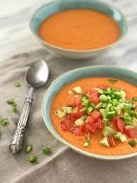 Pelar los ajos y picar los tomates y la cebolla. Colocar todas las verduras en una bandeja de horno hasta que empiecen a ablandarse. Colocar en la procesadora junto con el pepino pelado, el pimiento, la sal, el aceite de oliva y el vinagre, y procesarlos bien.