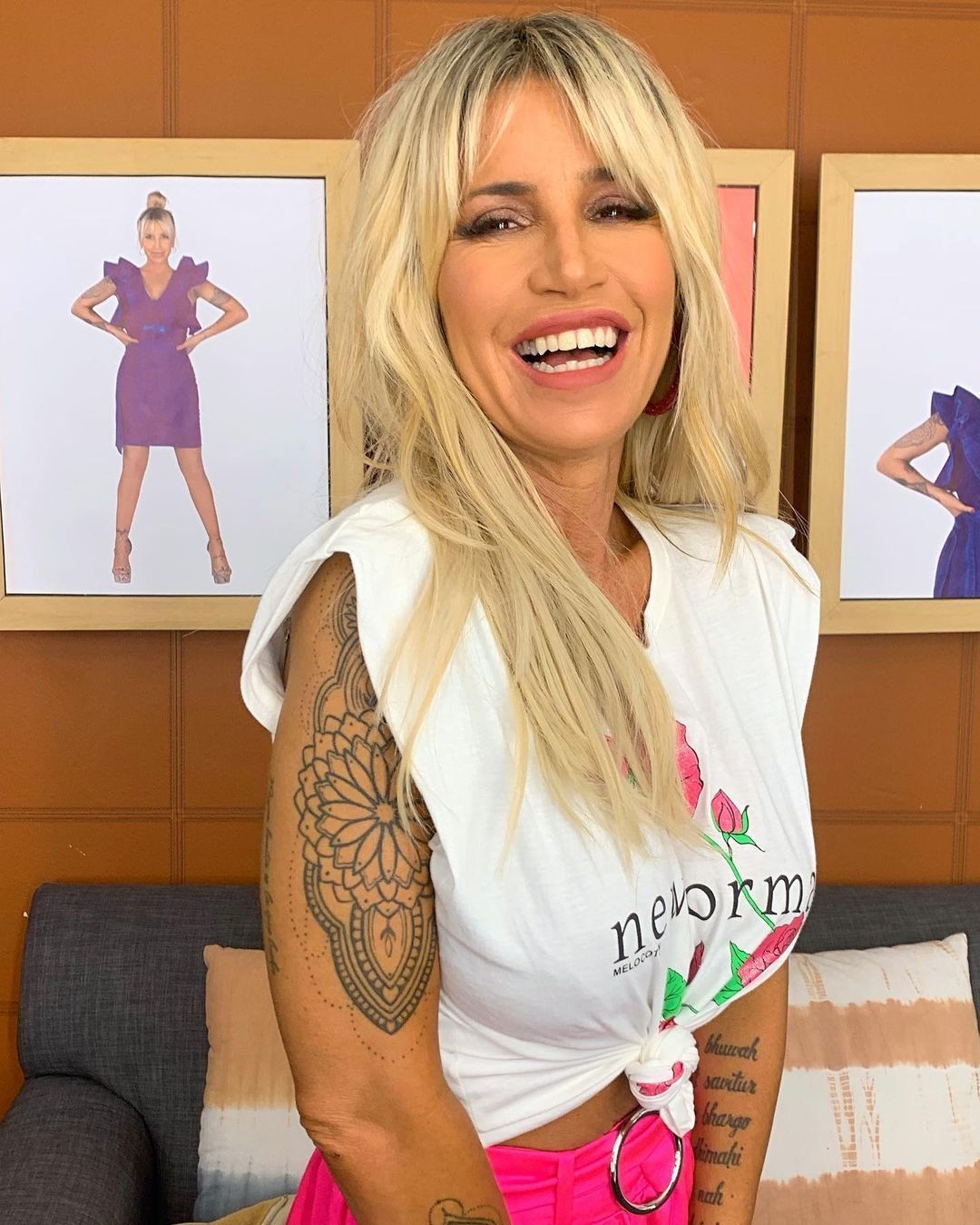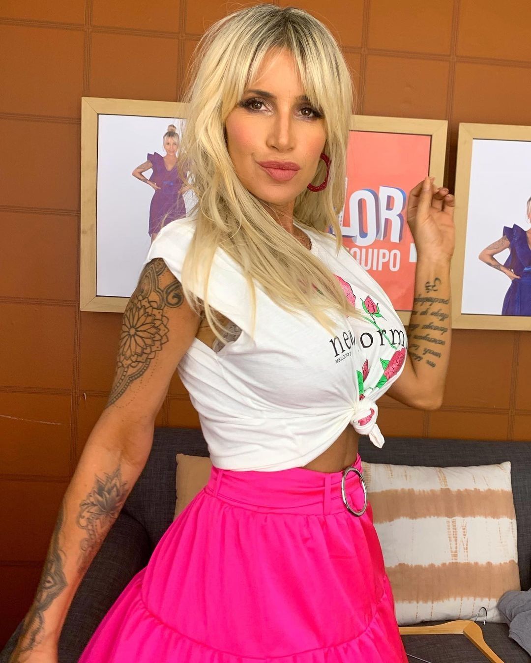 En las últimas horas, Florencia compartió dos fotografías y un video en su cuenta oficial de Instagram que se llevaron todas las miradas de sus millones de fanáticos. En la misma se puede ver a la bella blondaen el estudio de Telefe luciendo una musculosa blanca estampada con un nudo, una minifalda de color fucsia , un delicado make up y zapatos taco aguja de color nude.