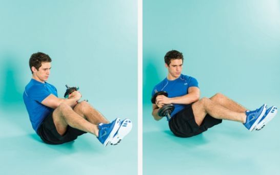 Para el último ejercicio, siéntate en una colchoneta y sostén las pesas en cada mano, con los codos flexionados. Además, procura no apoyar los pies en el suelo, sino tener las rodillas flexionadas durante el ejercicio. Tensa bien la musculatura abdominal y gira la cintura de un lado para otro, acompañando cada movimiento con el hombro y el brazo correspondiente. Repite al menos 20 veces el ejercicio para ver resultados.