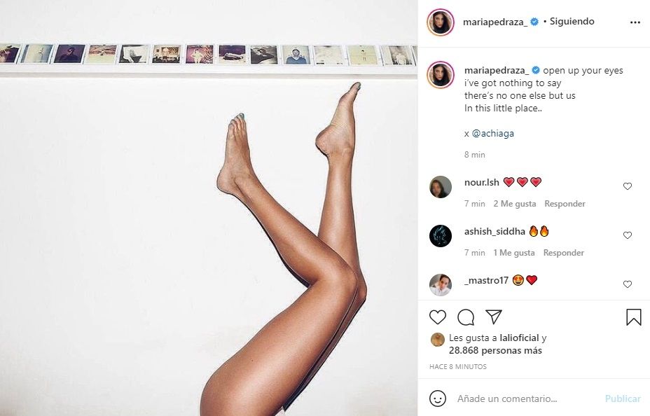 A la hora de enseñar su belleza, Pedraza no escatima absolutamente nada y genera un gran revuelo en la web cuando lo hace. Hace minutos compartió una instantánea en Instagram que impactó a más de uno de los internautas. "Open up your eyes, I’ve got nothing to say. There’s no one else but us in this little place (en español: abre tus ojos, no tengo nada que decir. No hay nadie más que nosotros en este pequeño lugar)", redactó junto a la imagen. El texto es un fragmento de la letra de la canción Runaway de The Blaze.