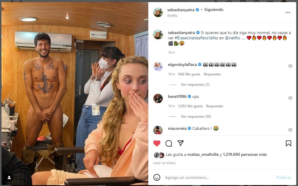 “Si quieres que tu día siga muy normal, no vayas a ver ‘Érase una vez pero ya no’ en Netflix”, colocó en la descripción de la publicación. La foto, que tiene más de 1 millón de ‘me gusta’ hasta el momento, provocó una oleada de comentarios por parte de otros artistas con cuentas verificadas, así como de los seguidores del artista. Además, a su lado, aparecen sus colegas mirando asombradas el desnudo de Sebastián.