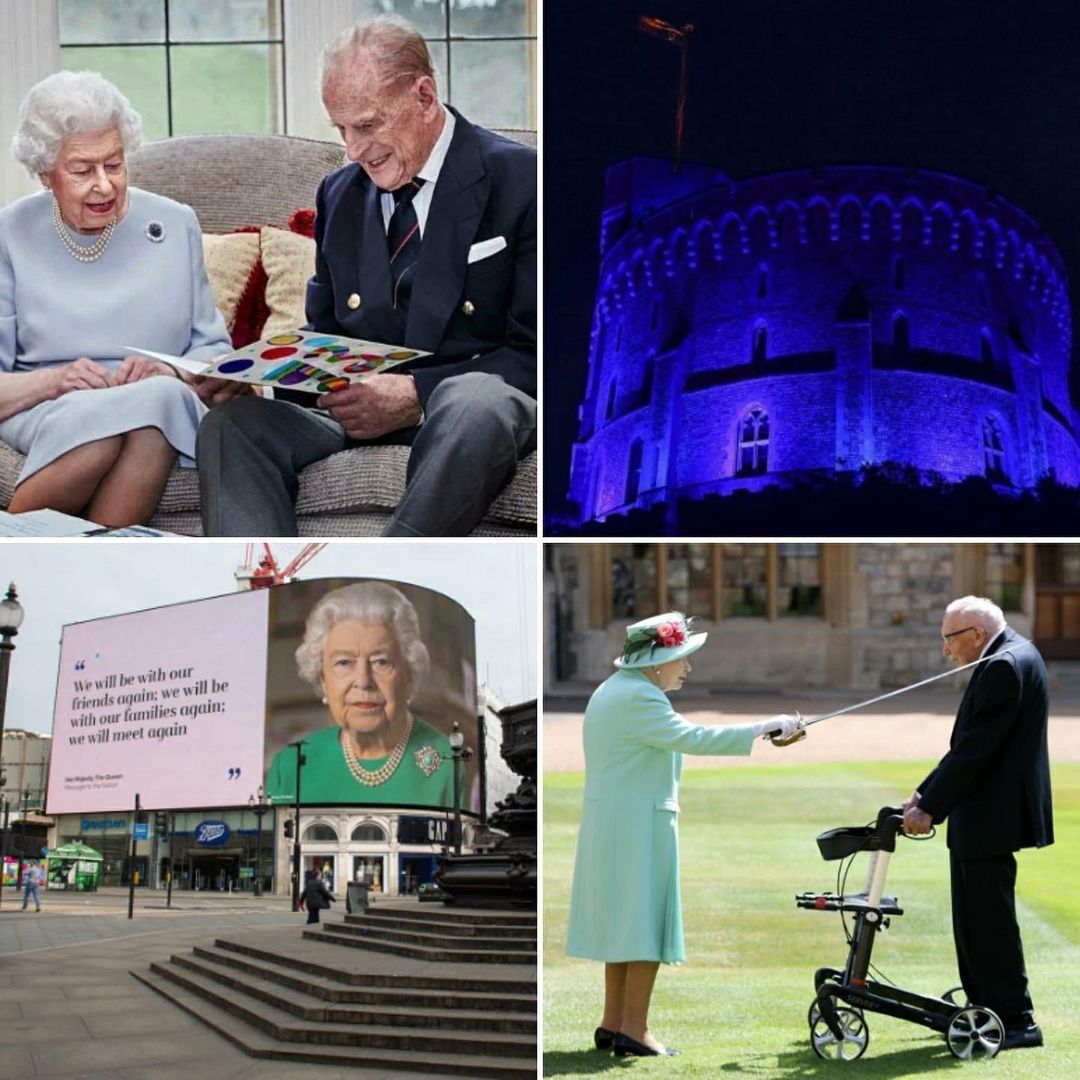 En la primera imagen se puede ver a la reina Isabel II junto con su esposo el Duque de Edimburgo. Ambos están sonriendo y recibiendo una tarjeta de felicitaciones por su aniversario número 73 de casados. En la segunda fotografía se ve el Round Tower del castillo Windsor, iluminado en color azul como señal de agradecimiento al personal del NHS, por su trabajo durante este año.