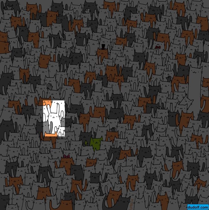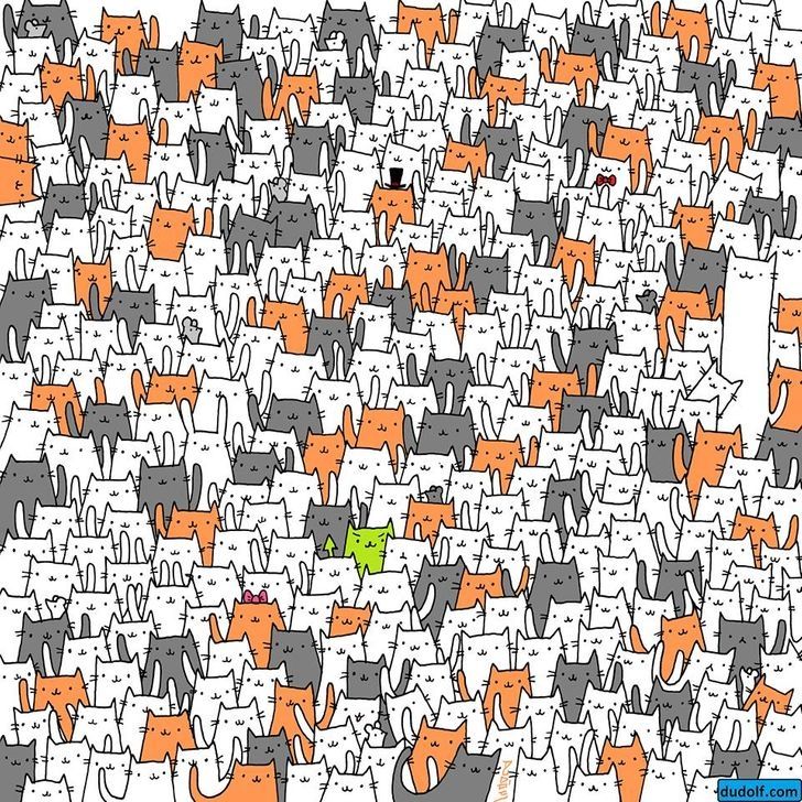 En esta lámina se puede ver decenas de gatos de distintos colores y tamaños en un fondo blanco. En este reto visual se encuentra un tierno y salvaje animal camuflado.