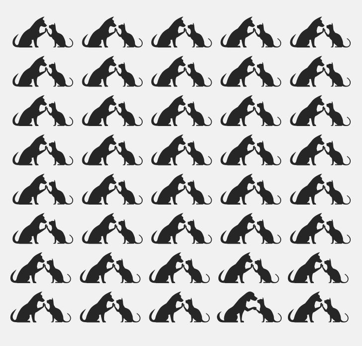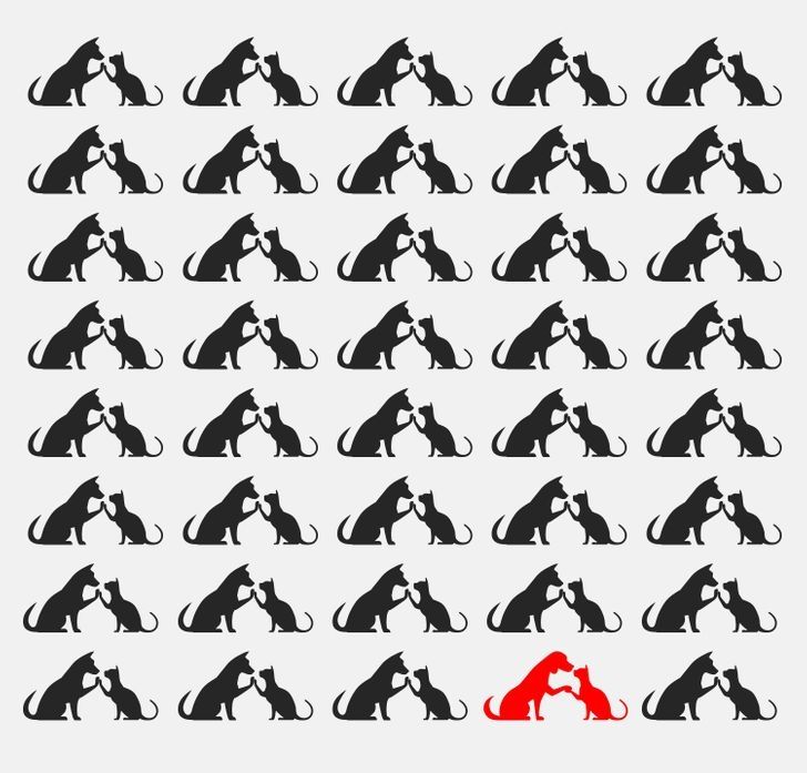 En esta mencionada lámina se puede observar varias adorables parejas de animales compuesta por un perro y un gato una al lado de la otra, estas son de color negro y se encuentran sobre un fondo blanco. En este nuevo reto visual se encuentra una de estas mencionadas parejas que no coincide con el resto.