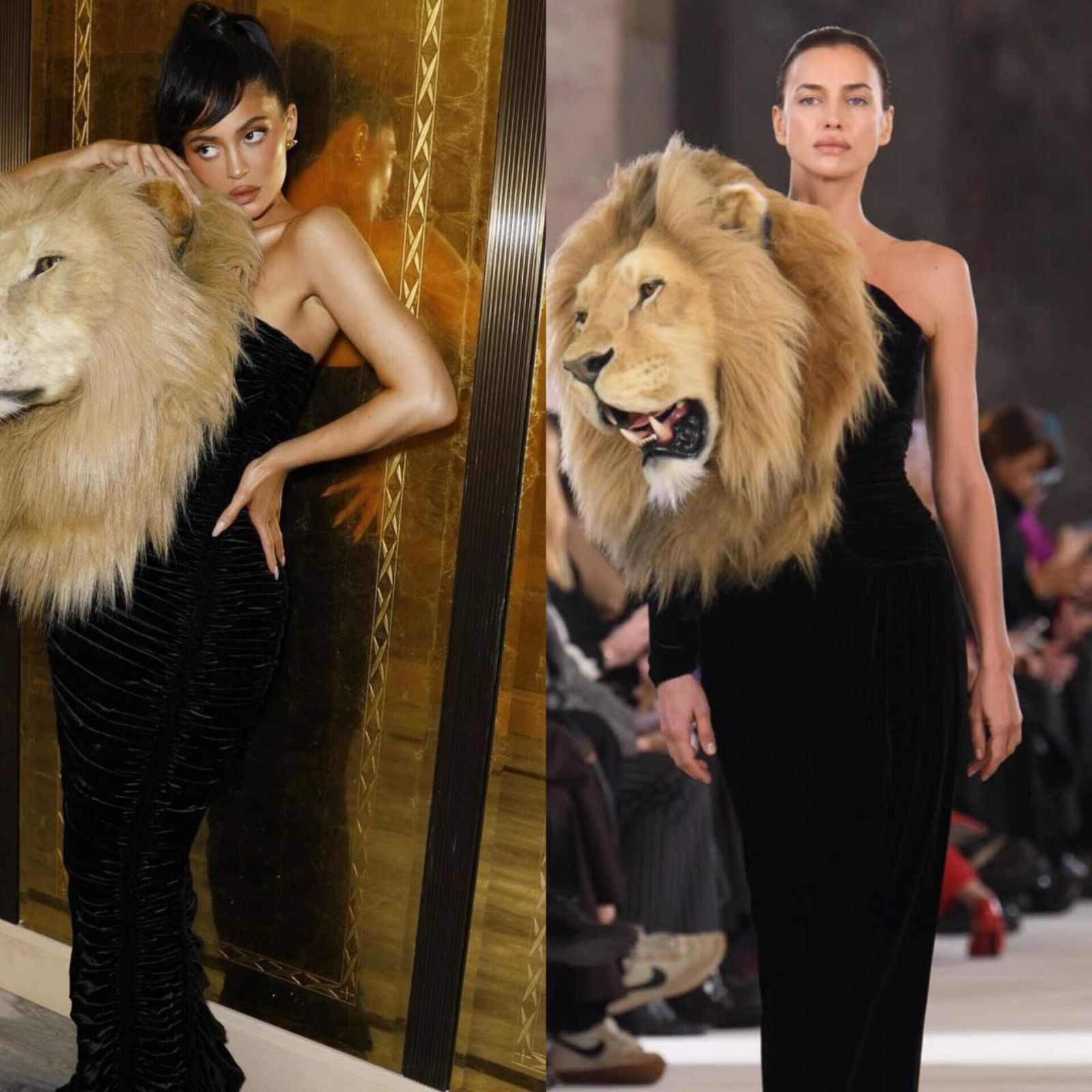 Una pasada que ha sido muy polémica no sólo por el hecho que dos modelos compartieron mismo diseño si no por la cosificacion de llevar puesto la cabeza de un animal y es que el diseñador quiso captar la atención de la elegancia con la atención al querer destacar la creatividad que puede surgir en una prenda de noche y es por ello que las artistas lucieron un vestido negro strapple terciopelado con el "detalle" de un trabajo ficticio al simular de forma muy real el rostro, en este caso de un león.