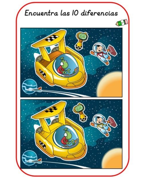 En esta colorida lámina podemos observar a un niño astronauta sujetando un maletín mientras busca ingresar a una pequeña nave de color amarilla en medio del espacio. Debajo de la misma aparece otra imagen que a primera instancia parece igual, pero no es así.