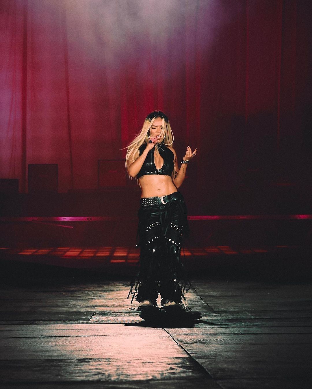 La artista dejó a la vista de todos sus curvas con un traje de baño negro de cuero. Este tenía un escote ultra pronunciado y dejaba su espalda al descubierto. Este lo combinó con un pantalón cargo que acentuó los movimientos de la cantante ya que contaba con algunos flecos.