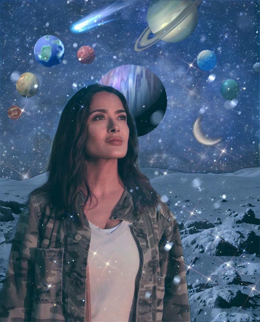 En esta oportunidad, Hayek se animó a publicar una imagen proveniente de una cuenta manejada por sus fans, @salmahayekonline. En la imagen se la ve a la actriz luciendo su significativa belleza con un look casual, una playera clásica con una chaqueta de estampado militar. En la foto parece que la actriz se encuentra en medio del espacio, porque se ve el cielo rebozado de estrellas, planetas e incluso un cometa, sin embargo, es una imagen editada.