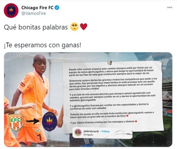 Chicago Fire anunció la contratación del jugador extranjero más joven en la historia de la liga. Se trata del colombiano Jhon Jader Duran, de 17 años, que dejará a Envigado para convertirse en jugador de la franquicia de la Major League Soccer.