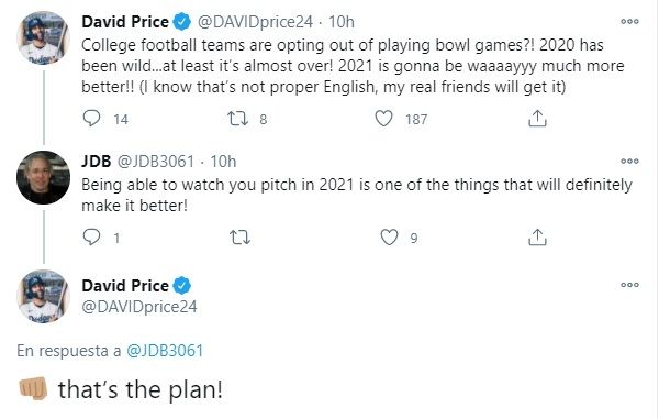 El sitio AlBat.com, recordó que con los Red Sox de Boston, durante el 2019, David Price consiguió un récord de 7-5 en ganados y perdidos, así como una efectividad de 4.28, en 22 aperturas. Ponchó a 128 oponentes y solamente regaló 32 bases por bolas en 107.1 entradas de labor.
