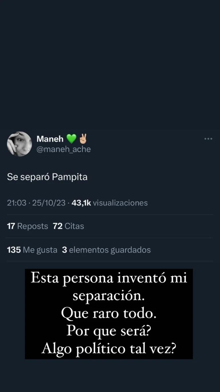 Carolina Ardohain se posicionó en el centro de atención luego de que trascendiera su supuesta separación de García Moritán. Para poner fin al rumor, la modelo decidió utilizar sus redes sociales e hizo una descarga: "Esta persona inventó mi separación. Qué raro todo. ¿Por qué será? ¿Algo político tal vez?", con una foto del posteo del usuario que había iniciado el rumor.