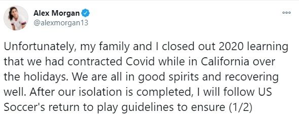 "Todos estamos de buen humor y nos recuperamos bien. Una vez que se complete nuestro aislamiento, seguiré las pautas de regreso al juego de US Soccer para asegurarme de que mi cuerpo se recupere por completo y pueda unirme pronto a mis compañeras de equipo", señaló la jugadora.