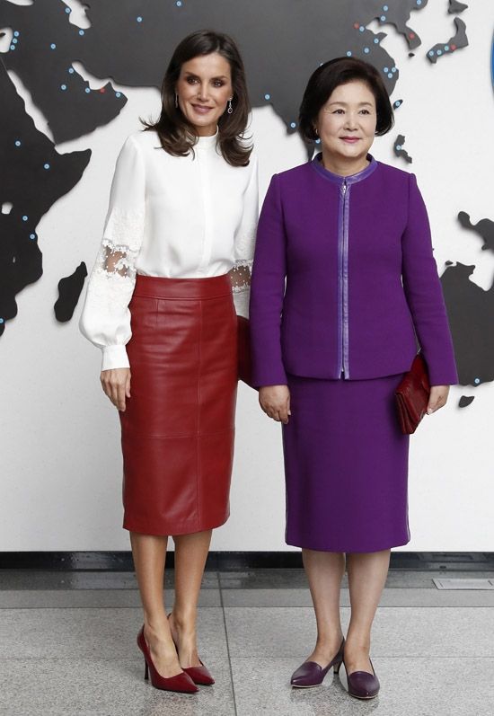 Se trata de una falda corte lápiz de cuero, en color rojo. doña Letizia usó la icónica falda en su en Seúl durante su Viaje de Estado a Corea, el pasado otoño. La royal española volvió a vestirse con su Hugo Boss roja de cuero hoy en los salones del Palacio de la Zarzuela.