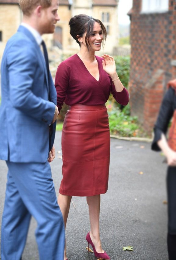 Markle usó esta prenda de diseño también el otoño pasado. Con 24 horas de diferencia de Letizia Ortiz. La combinó con una blusa en rojo más oscuro.