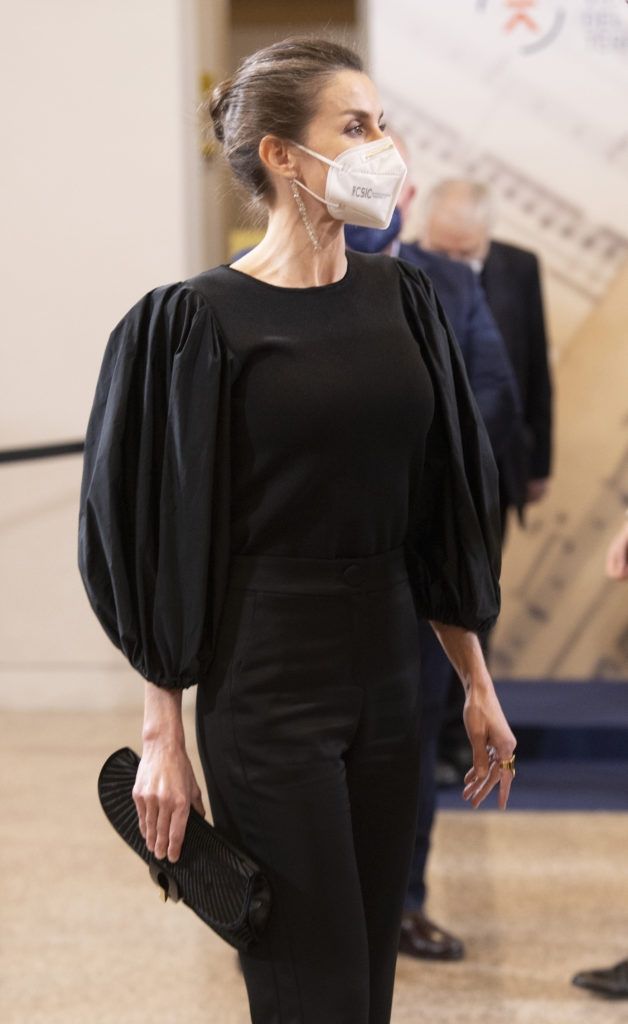 El total black fue roto únicamente por el barbijo que utilizó. La monarca llevó un make up sutil, pendientes largos y su cabello con un pequeño recogido. Sin dudas, la prenda que se llevó todas las miradas fue su blusa con mangas abullonadas y de gran volumen.