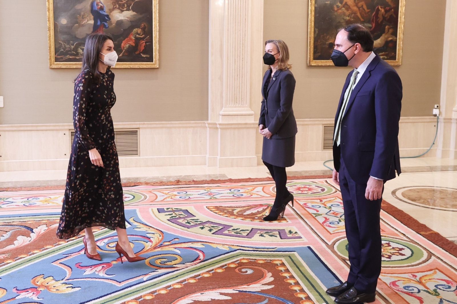Para la ocasión, la reina optó por recuperar de su armario uno de sus vestidos más favorecedores de Massimo Dutti. El diseño lo estrenó a finales de 2019 durante un viaje oficial a Corea del Sur. Es un vestido camisero midi azul marino con un estampado de confeti de colores, cuello redondo con un detalle de apertura en forma de lágrima en la zona del escote. La manga es larga y está terminada en un puño abotonado.