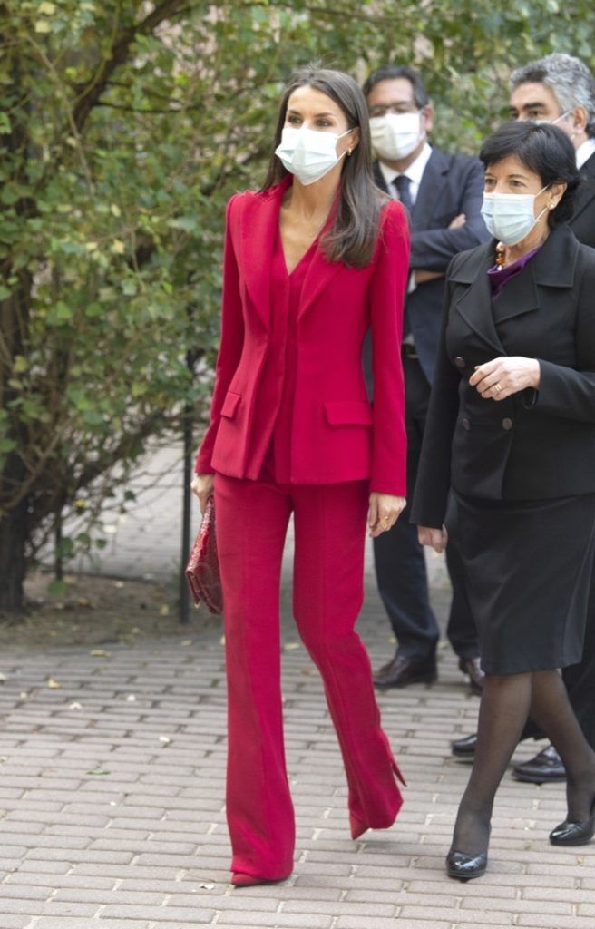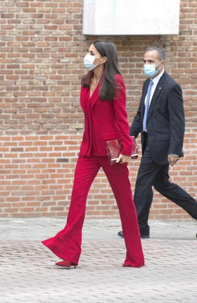 El outfit de Letizia cuenta con un saco y pantalón de corte acampanado, con un sobrio corte lateral. El color elegido: un rojo fuerte. Uno de los tonos que acompaña al negro y al verde, como los colores de la temporada. Una elección que le favorece muchísimo.